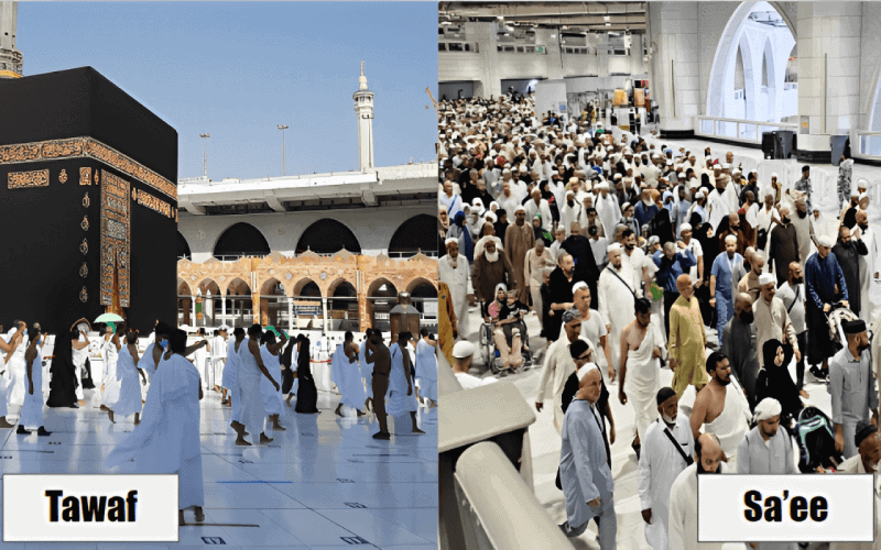 Tawaf et Sa'ee sont deux rituels pratiqués à Masjid-Al-Haram mais la méthode est différente. Pendant le Tawaf, les pèlerins font sept fois le tour de la Kaaba.